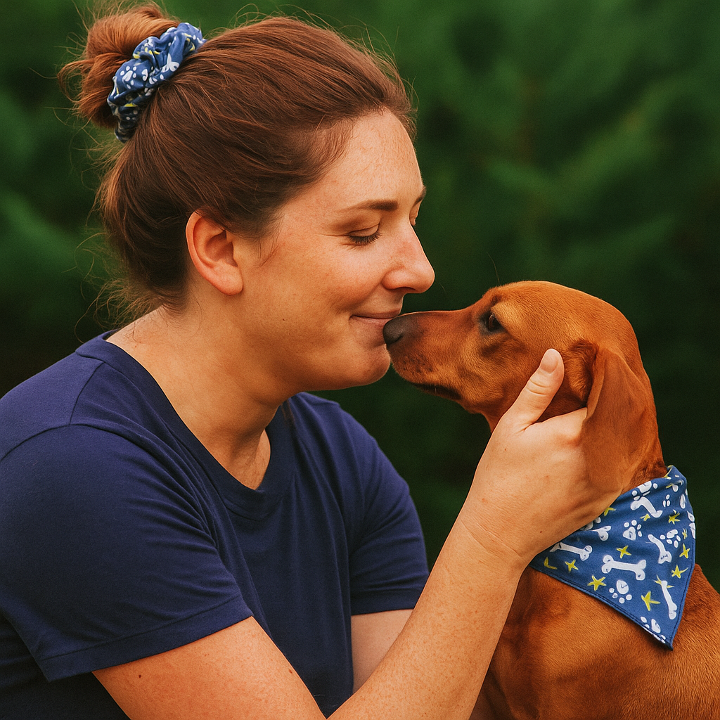 Introducing our 'Pawsitively Adorable' matching set – a charming combination of a blue dog bandana and a coordinating hair scrunchie, both adorned with delightful bones and paw prints.